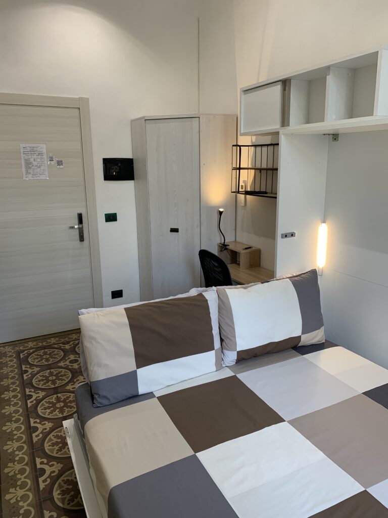 WHITE ROOM smart, self lock, accogliente e silenziosa, rivolta a sud, col servizio igienico in camera, letto matrimoniale king size, tv 50″ smart, biancheria per camera e bagno, Google home, luci, tv, clima. Incluso mini-frigo con acqua, caffè Lavazza, bollitore, the e brioches